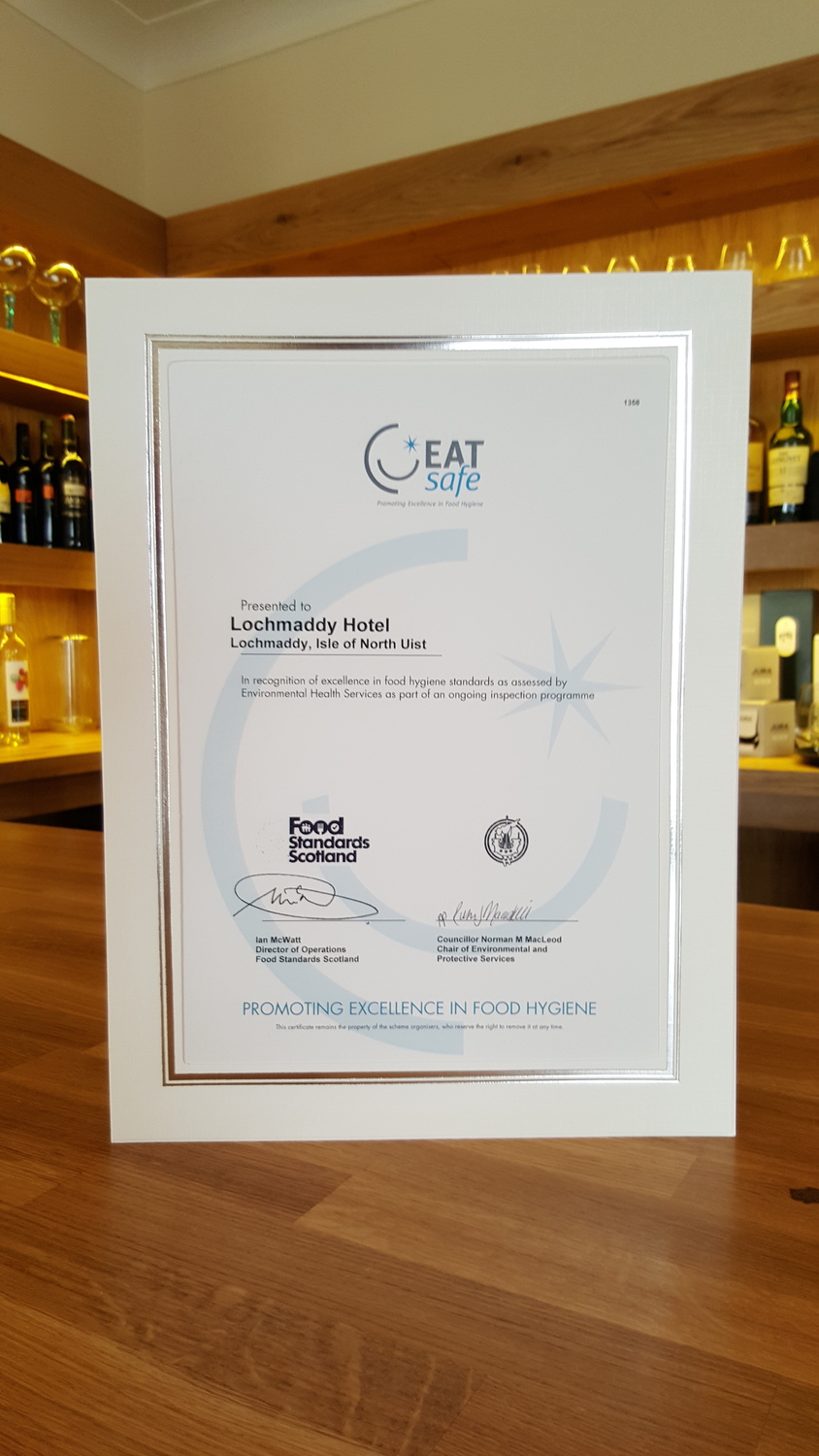 We operate to the highest standards of food hygiene at all times and this has been recognised by the Environmental Health and the Scottish FSA (food standards agency) where we have attained an Eat Safe Award. This is only for establishments that go "above and beyond" standard hygiene practises, and currently we are the only hotel in the Western Isles with one.
